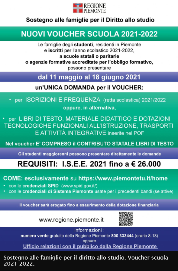 Le famiglie degli studenti, residenti in Piemonte e iscritti per l’anno scolastico 2021-2022, a scuole statali o paritarie o agenzie formative accreditate per l’obbligo formativo, possono chiedere ENTRO IL 18 GIUGNO 2021