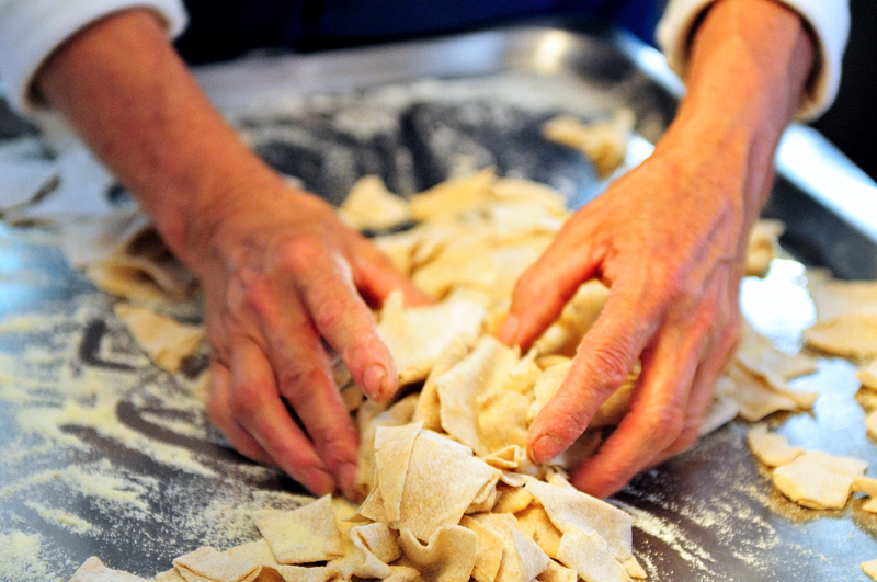 Pasta maltagliata condita con formaggi fusi o sugo di funghi, gherigli di noce, patate e rape tagliate a pezzi e cotte preventivamente con la pasta.